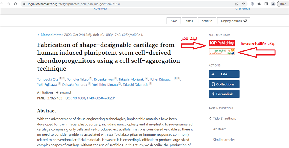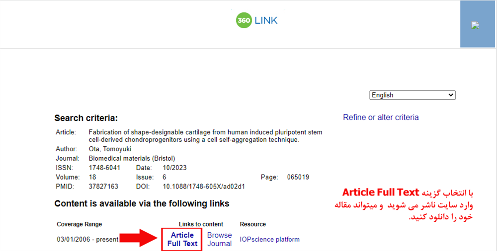 راهنما جستجو و دالنلود مقاله از پایگاه ها با استفاده از Pubmed 2نوین لیب(کتابخانه دیجیتال نوین)10/19/2025برای جستجو و دانلود مقاله از پایگاه ها به وسیله Pubmed ، پس از وارد کردن کلید واژه م ... برای جستجو و دانلود مقاله از پایگاه ها به وسیله Pubmed ، پس از وارد کردن کلید واژه مورد نظر و جستجو شما میتوانید مقاله مورد نظر خود را انتخاب کنید. در داخل صفحه باز شده در قسمت روبه روی عنوان مقاله، گزینه ای به نام لینک ها (Links) قابل مشاهده می باشد که در این قسمت شما دو گزینه را میتوانید مشاهده کنید ابتدا لینک ناشر مقاله قرار دارد و و در زیر آن لینک مربوط به Research4life ، از این دو مسیر شما میتوانید مقاله مورد نظر خود را دانلود کنید. در صورتی که شما بر روی لینک مربوط به ناشر کلیک کنید مستقیماً وارد سایت ناشر خواهید شد که میتوانید مقاله خود را دانلود کنید. اما اگر گزینه Research4life را انتخاب کنید ابتدا وارد صفحه ای میشوید که مشخصات مقاله و مجله مورد نظر و ناشر آن برای شما نمایش داده میشود و از آنجا شما میتوانید با انتخاب گزینه Article full text وارد سایت ناشر شده و از سایت ناشر مقاله خود را دانلود کنید. راهنمای تصویری در زیر نمایش داده شده است نکته مهم : در صورتی که در نتایج جستجو با انتخاب لینک سایت ناشر قادر به دانلود مقاله از ناشر نبودید لطفاً گزینه Research4life را انتخاب کنید و در صفحه مربوطه شما بایدمانند تصویر زیر گزینه Connect here FIRST to enable access را انتخاب کنید. این مورد برای دسترسی و فعال شدن دانلود مقاله از طریق Pubmed برای ناشرهای Springer ،Thieme , Nature باید انجام شود . البته این کار تنها یک بار نیلز به انجام دارد. 5.0