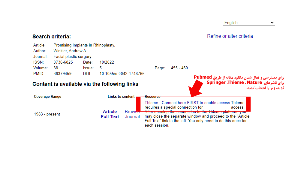 راهنما جستجو و دالنلود مقاله از پایگاه ها با استفاده از Pubmedنوین لیب(کتابخانه دیجیتال نوین)10/18/2025برای جستجو و دانلود مقاله از پایگاه ها به وسیله Pubmed ، پس از وارد کردن کلید واژه مورد نظر و ... برای جستجو و دانلود مقاله از پایگاه ها به وسیله Pubmed ، پس از وارد کردن کلید واژه مورد نظر و جستجو شما میتوانید مقاله مورد نظر خود را انتخاب کنید. در داخل صفحه باز شده در قسمت روبه روی عنوان مقاله، گزینه ای به نام لینک ها (Links) قابل مشاهده می باشد که در این قسمت شما دو گزینه را میتوانید مشاهده کنید ابتدا لینک ناشر مقاله قرار دارد و و در زیر آن لینک مربوط به Research4life ، از این دو مسیر شما میتوانید مقاله مورد نظر خود را دانلود کنید. در صورتی که شما بر روی لینک مربوط به ناشر کلیک کنید مستقیماً وارد سایت ناشر خواهید شد که میتوانید مقاله خود را دانلود کنید. اما اگر گزینه Research4life را انتخاب کنید ابتدا وارد صفحه ای میشوید که مشخصات مقاله و مجله مورد نظر و ناشر آن برای شما نمایش داده میشود و از آنجا شما میتوانید با انتخاب گزینه Article full text وارد سایت ناشر شده و از سایت ناشر مقاله خود را دانلود کنید. راهنمای تصویری در زیر نمایش داده شده است . نکته مهم : در صورتی که در نتایج جستجو با انتخاب لینک سایت ناشر قادر به دانلود مقاله از ناشر نبودید لطفاً گزینه Research4life را انتخاب کنید و در صفحه مربوطه شما بایدمانند تصویر زیر گزینه Connect here FIRST to enable access را انتخاب کنید. این مورد برای دسترسی و فعال شدن دانلود مقاله از طریق Pubmed برای ناشرهای Springer ،Thieme , Nature باید انجام شود . البته این کار تنها یک بار نیلز به انجام دارد. 5.0